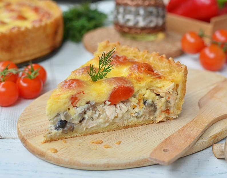 Ингредиенты: сливочное масло (125 г), куриное яйцо (1 шт.), вода (3 ст. л.), пшеничная мука (250 г), куриное филе (330 г), шампиньоны (250 г), репчатый лук (180 г), помидоры черри (7 шт.), молотый черный перец (щепотка),твердый сыр (150 г), сливки 30% (300 мл), соль (щепотка).