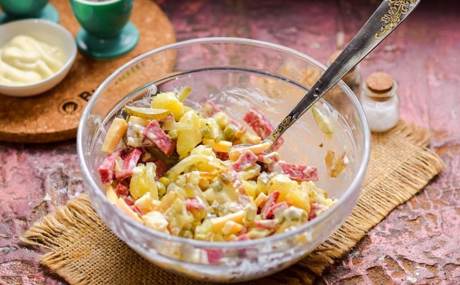 Ингредиенты: сырокопченая колбаса (200 г), твердый сыр (200 г), картофель (3 шт.), маринованные огурцы (3-4 шт.), зеленый консервированный горошек (1 банка), красный лук (1 шт.), соль, черный молотый перец, майонез (2 ст. л.).