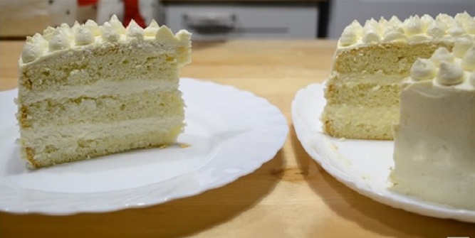 Готовый бисквит вытаскиваем из формы и оставляем остывать. Затем заворачиваем в пищевую пленку и отправляем в холодильник на несколько часов. После - достаем и разрезаем на 3 равных коржа.