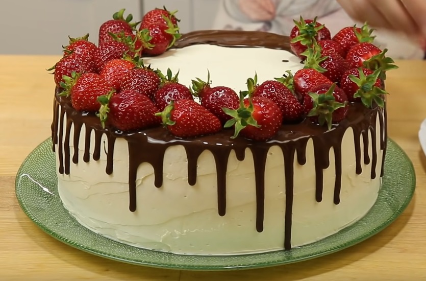 Для глазури растапливаем шоколад с маслом на водяной бане. Делаем декор с подтеками из глазури и украшаем торт ягодами или фруктами на ваш вкус.