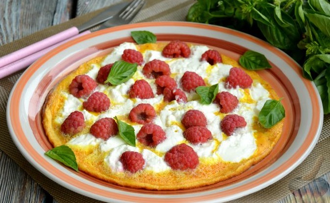 Затем сверху на омлет выкладываем небольшие порции сладкого творога, немного отступив от края. Следом – между омлетом и островками творога – ягоды малины (или клубники, ежевики, смородины).