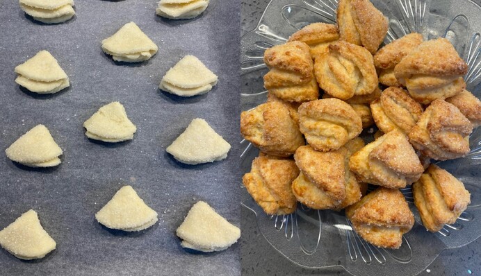Каждый кружочек обваливаем в сахаре и складываем 2 раза пополам. Выкладываем творожное печенье на противень, выстеленный пергаментной бумагой.
