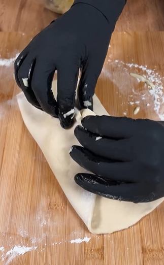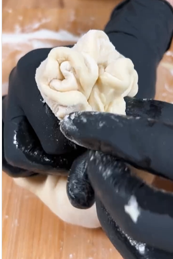 Формируем мешочек, который расплескиваем руками в форме блинчика с начинкой внутри.
