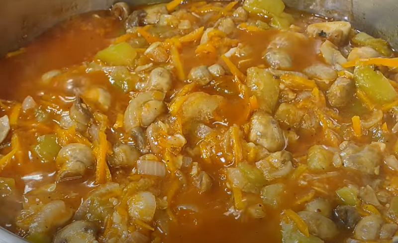 Складываем в кастрюлю с кабачками обжаренные морковь, лук и шампиньоны, а затем добавляем соус сацебели, выжатый через пресс чеснок, молотый черный перец и перемешиваем всю массу лопаткой, пытаясь поднять со дна все овощи", - добавила хозяйка.