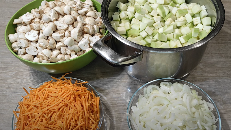 "В этом салате есть четыре основных ингредиента, которые мы заранее подготовили: 2 с половиной килограмма кабачков нарезали небольшими кубиками, полтора килограмма шампиньонов небольшого размера разрезали пополам, 500 г моркови натерли на корейскую терку небольшими полосками и 500 г лука нарезали полукольцами.