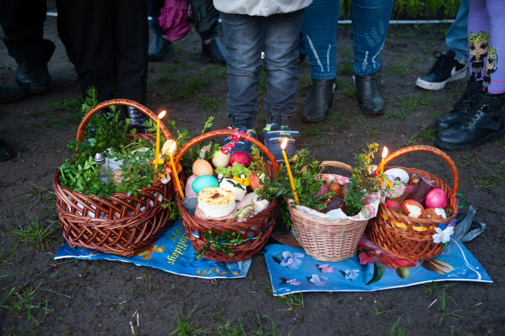 После ночной литургии начинается освящение пасхальных корзинок, которые верующие приносят в церковь. В корзины принято класть паски, вареные яйца (крашенки и писанки), колбасу, хрен, соль. Алкоголь, кровянку, деньги, украшения, фрукты и овощи святить не принято.
