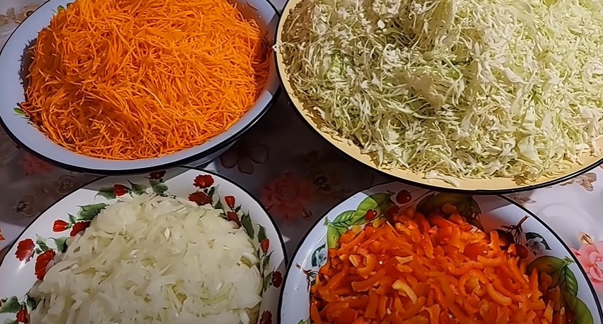 Приготовление: капусту пошинкуйте как на салат. Морковь измельчите как на морковь по-корейски. Лук и перец также режем как салат.