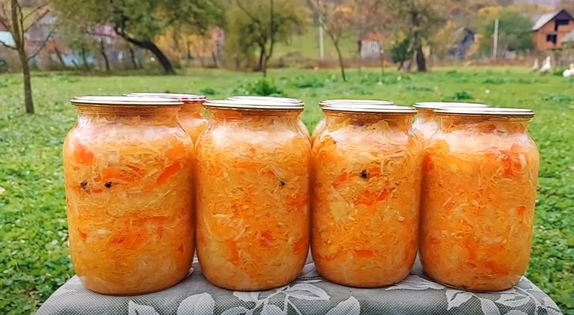 Ингредиенты: капуста 4 кг, морковь 2 кг, лук 1 кг, болгарский перец 1 кг, соль 200 гр, уксус 250 гр, сахар 100 гр, растительное масло 600 гр, лавровый лист, черный перец в виде горошка.