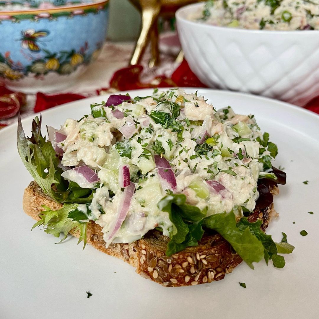 Ингредиенты: 1 банка консервированного тунца в собственном соку (180 г), 1 стебель сельдерея (50 г), половина небольшой луковицы (50 г), 1 ст. ложка белого несладкого йогурта, 2 ст. ложки лимонного сока, 2 ч. ложки горчицы, 1 стебель зеленого лука, небольшой пучок петрушки, соль и черный молотый перец по вкусу.