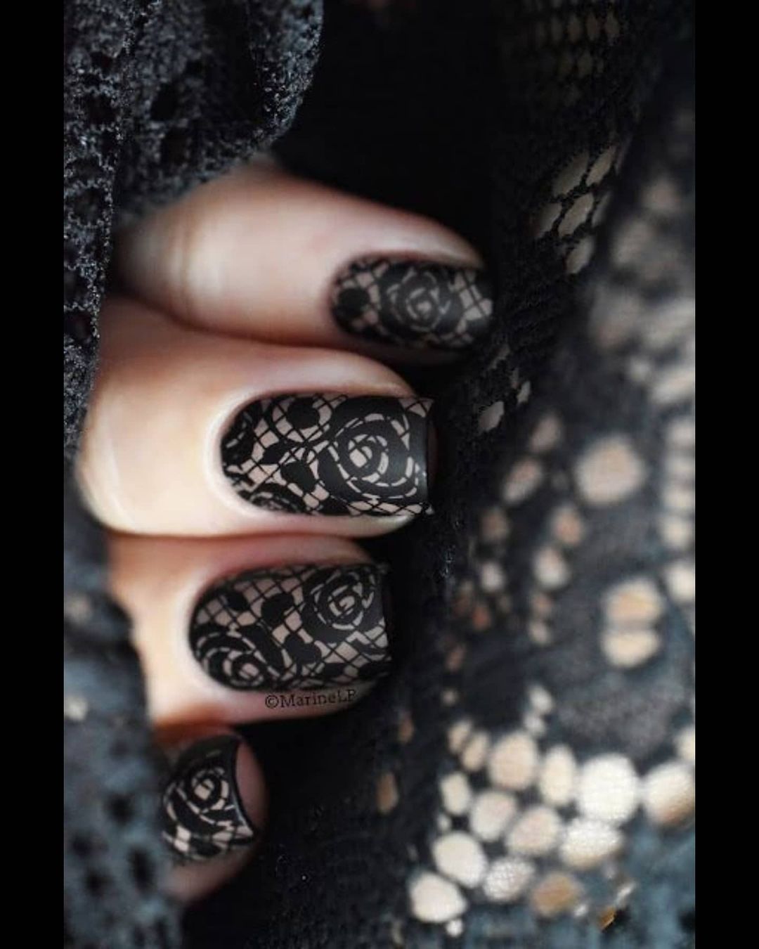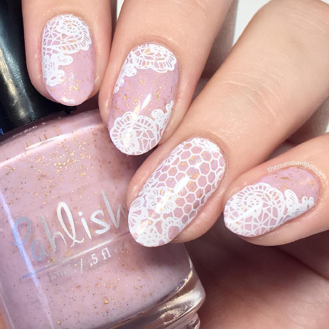 Добавьте кружевные узоры с помощью наклеек или трафаретов для ногтей, чтобы создать нежный и романтический образ, который будет гармонировать с вашим праздничным аутфитом.