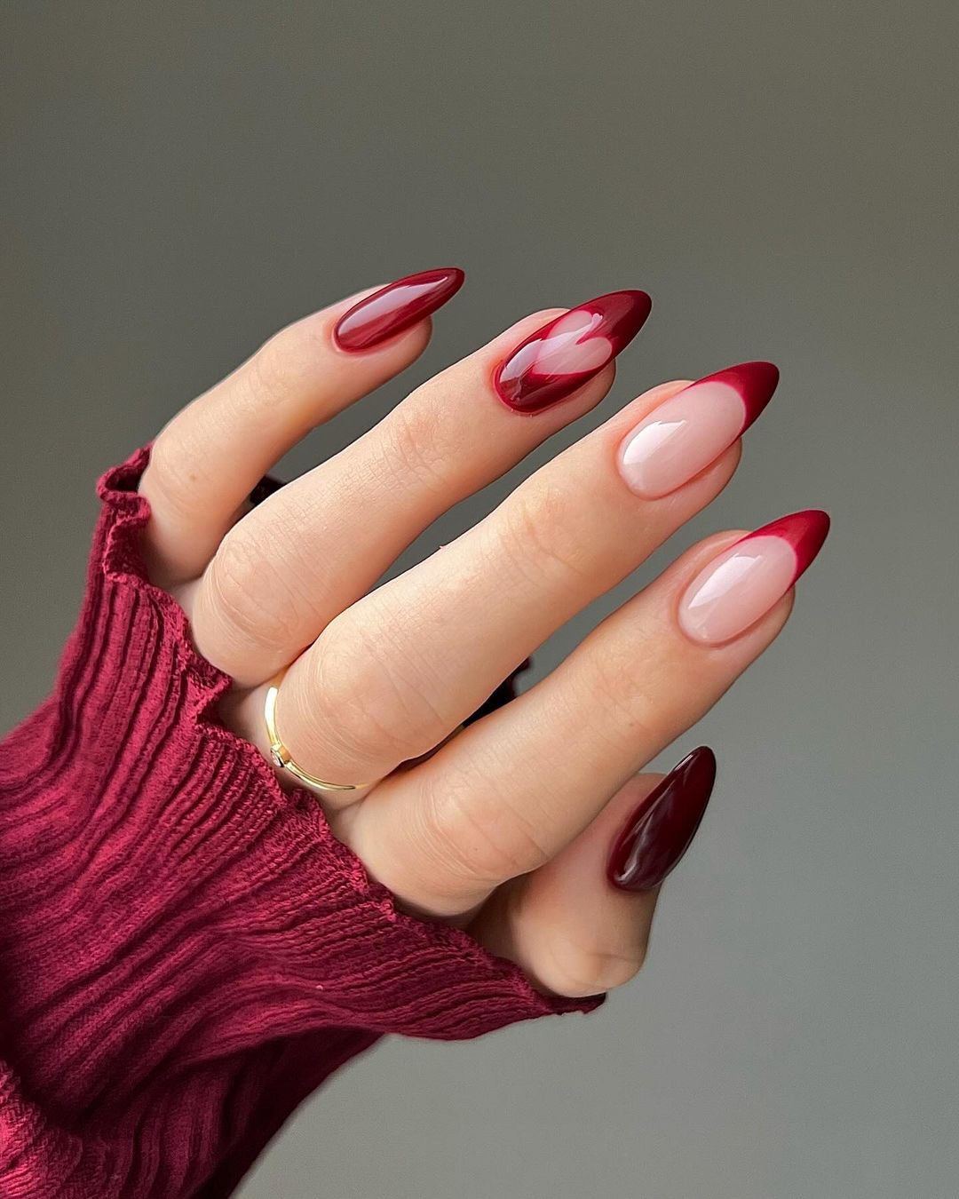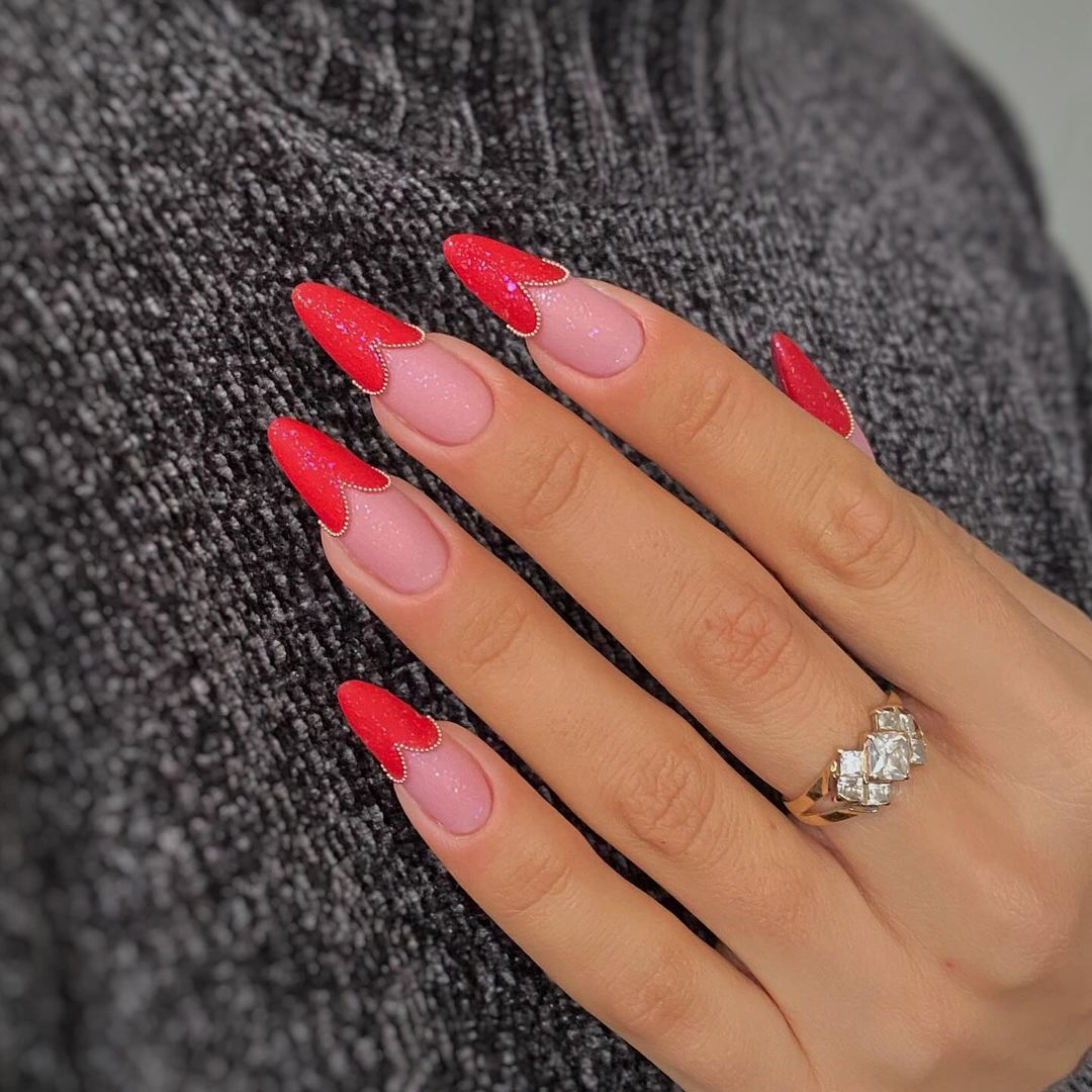 Добавьте романтическую нотку классическому французскому маникюру, сделав красные кончики ногтей красными или в форме сердечек.