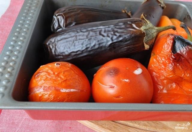 Помидоры подпекаем на гриле (сковороде) или в духовке при температуре 200°C 5-7 минут и снимаем с них кожуру. Даем остыть.