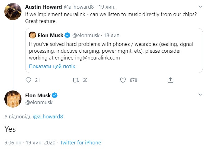 В своих новых твитах Маск также заинтриговал фолловеров любопытной деталью: отвечая на расспросы подписчиков, он подтвердил догадки, что вживляемые чипы позволят людям слушать музыку без использования наушников - просто из своего мозга. Кроме этого, с помощью чипа якобы можно будет контролировать уровень гормонов и других биохимических медиаторов - например, контролировать чувство тревоги.