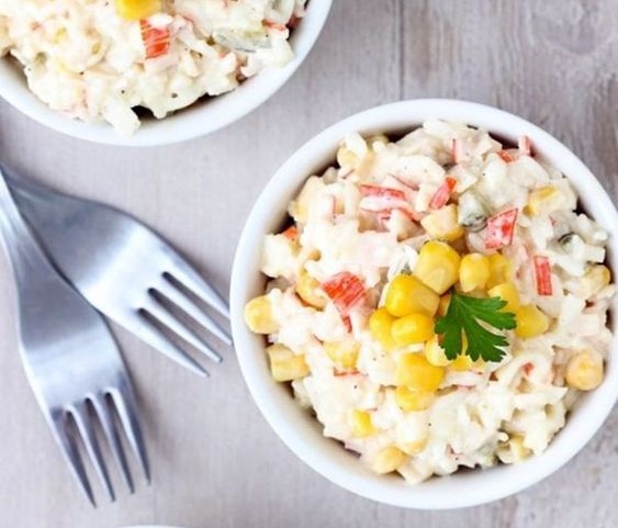Отметим, что для классического рецепта этого салата необходимо взять крабовые палочки, консервированную кукурузу, куриные яйца, рис, репчатый лук, майонез и огурцы. Некоторые хозяйки исключили из него рис, так как не всегда есть время на его приготовление. Рекомендуем вам попробовать сделать другие варианты салата с крабовыми палочками.