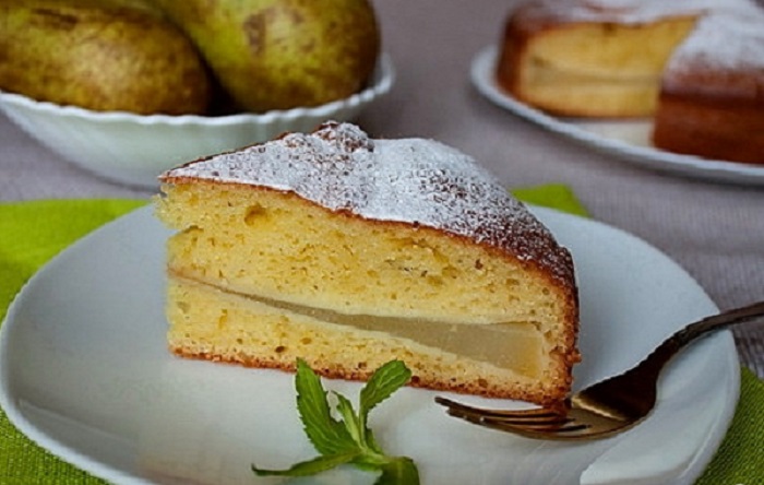 Ингредиенты: груши (2 шт.), яйца (4 шт.), пшеничная мука (1 стакан), сливочное масло (80 г), топленое молоко (0,25 стакана), цедра апельсина (40 г), сахар (3 ст. л.), растительное масло (1 ст. л.), лимонный сок (10 мл), сахарная пудра (1 ч. л.), разрыхлитель для теста (1 ч. л.), молотая корица (0,5 ч. л.), молотый кардамон (0,5 ч. л.), соль (2 г).