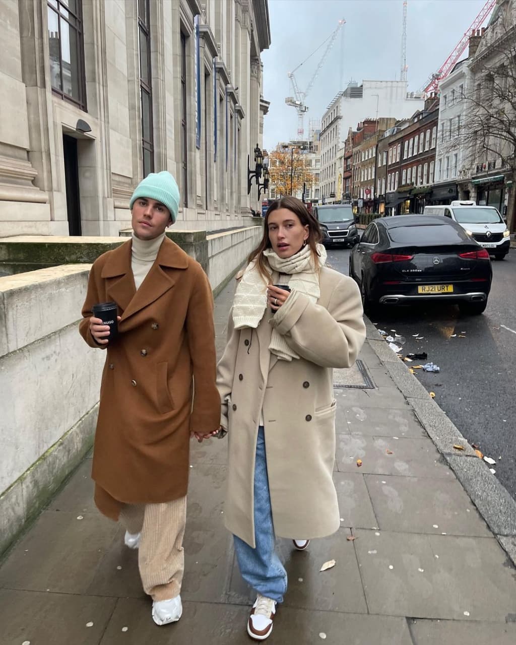 Канадский исполнитель Джастин Бибер следит за трендами вместе со своей женой Хейли. Так, влюбленная парочка вышла на прогулку в очень похожих нарядах: пальто размера оверсайз, джинсы, спортивная обувь. Только если Джастин разбавил аутфит ярко-бирюзовой шапкой, то его избранница решила быть более сдержанной и выбрала шарф молочного оттенка.