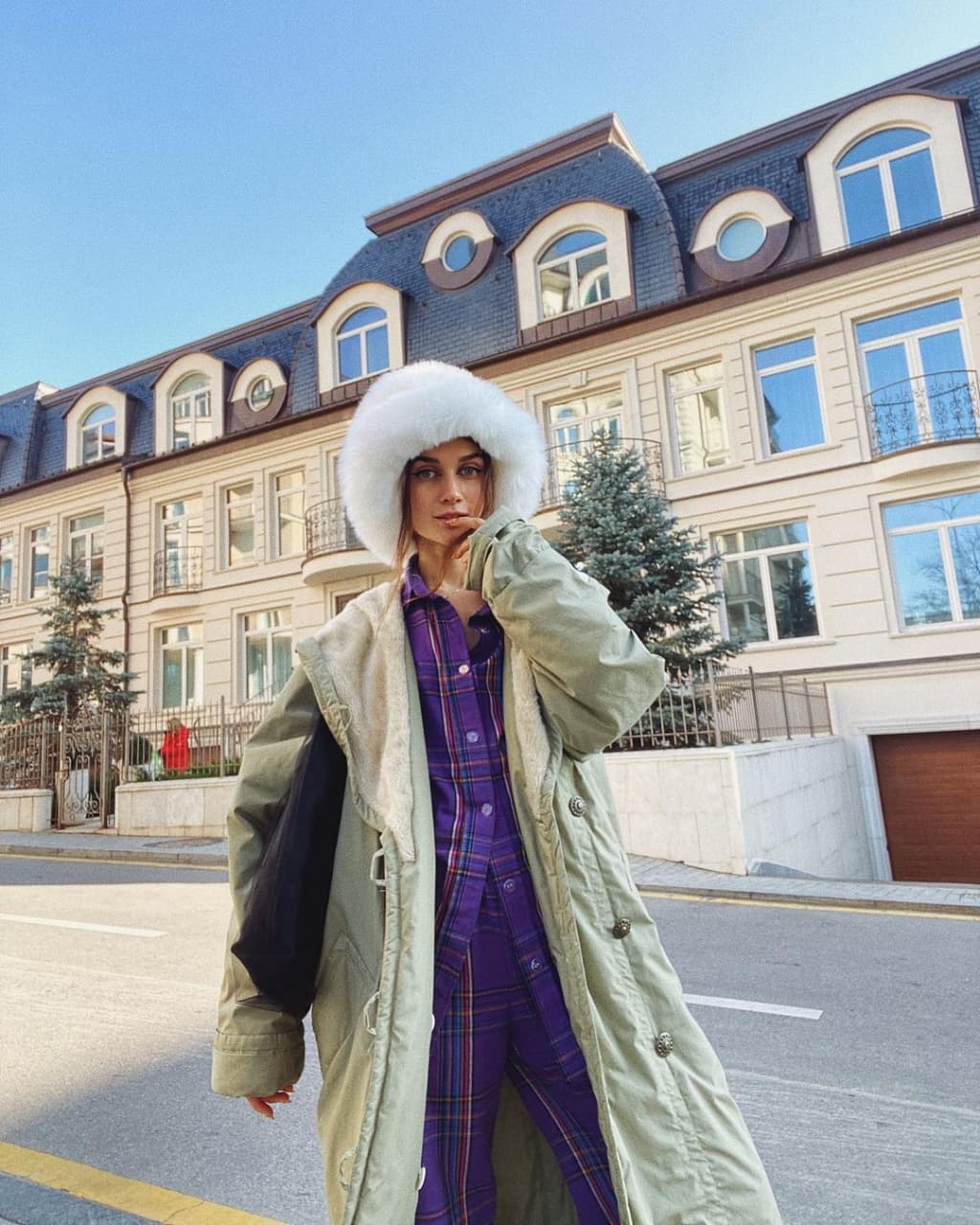 А вот исполнительница Jerry Heil (Яна Шемаева) не побоялась примерить длинный плащ-пуховик, который сразу же привлекает внимание. Изделие выполнено в фисташковом цвете и декорировано объемными пуговицами по всей длине. Подчеркнуть смелый образ певица решила меховой шапкой.