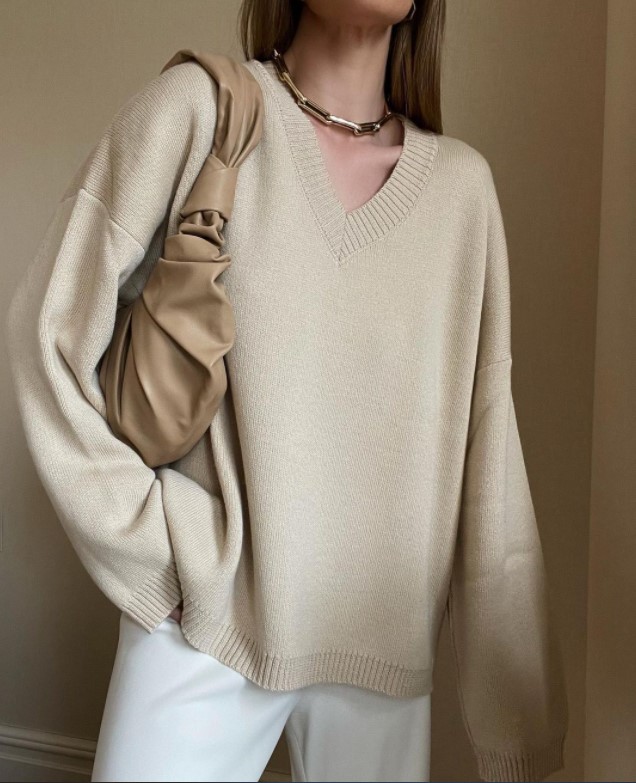 - Даже нося оверсайз, не бойтесь открывать некоторые участки тела. К примеру, выберите свитер с открытой шеей или плечами, оверсайз кардиган отлично подойдет в V-образному вырезу – сразу откроется красивое декольте.