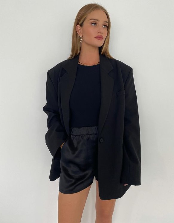 На другом снимке Роузи предстала коротких шортах из атласной ткани, черной водолазке, а оверсайз пиджак сделал этот лук гармоничным и полноценным. Объемные украшения и легкий макияж добавили образу немного изысканности.