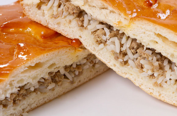 Для приготовления вам понадобятся такие продукты: молоко (200 мл), мука (400 г), сахар (50 г), сухие дрожжи (6 г), масло сливочное (45 г), яйца (2 шт.), соль (0.5 ч. л.), желток (1 шт., для смазки пирога), молоко (1 ст. л., тоже для смазки пирога). Начинка: отварное мясо (600 г), рис (0.25 стакана), лук (2 шт.), сливочное масло (1 ст. л.), растительное масло (для жарки), соль и перец (по вкусу).