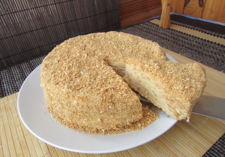 Ставим первый слой на блюдо и смазываем его кремом, затем второй корж, снова крем и т.д. Оставляем торт примерно на час при комнатной температуре, чтобы он пропитался кремом. Измельчаем коржи для посыпки и декорируем ими торт на ваше усмотрение. Затем ставим его на 12 часов в холодильник, а после подаем к чаю.