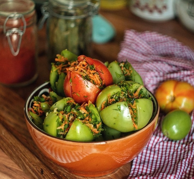 Для некоторых хозяек приготовление блюд является своеобразным хобби, которое помогает отвлечься от тревожных новостей и депрессивных мыслей. И если вы уже закрыли на зиму несколько банок зеленых помидоров с чесноком и перцем, побалуйте близких маринованными помидорами, начиненными морковью и зеленью, которые можно кушать уже на следующий день. theLime делится простым рецептом.
