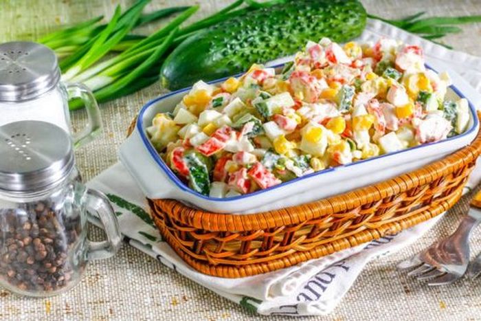 Ингредиенты: яйца (4 шт.), свежий огурец (1 шт.), консервированная кукуруза (150 г), крабовые палочки (240 г), зеленый лук (несколько перьев), майонез (3 ст.л.), соль, перец (по вкусу).