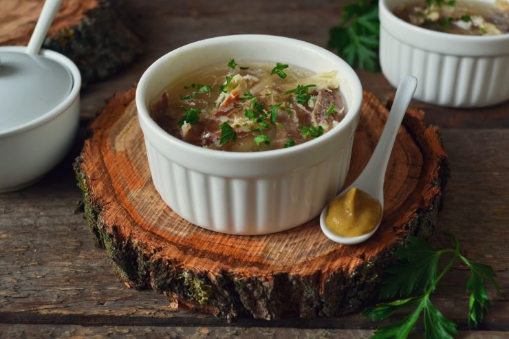 Берем нужное количество бульона (около 600 мл), процеживаем его, добавляем желатин и тщательно перемешиваем.
