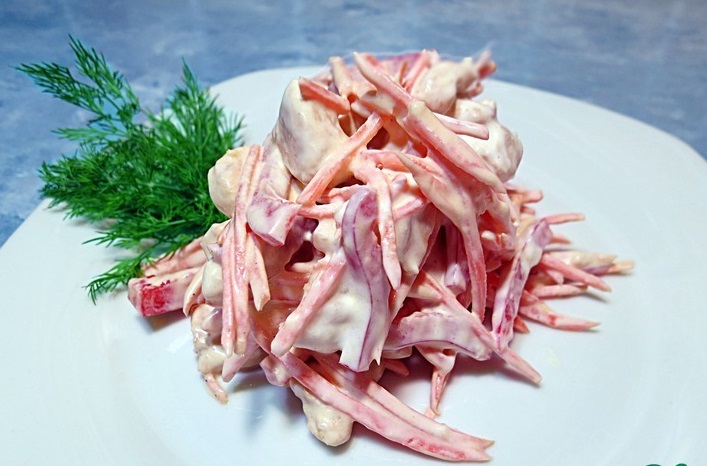 Выкладываем все подготовленные ингредиенты в салатник, добавляем соль, перец и майонез. Тщательно перемешиваем и подаем грузинский куриный салат к столу.