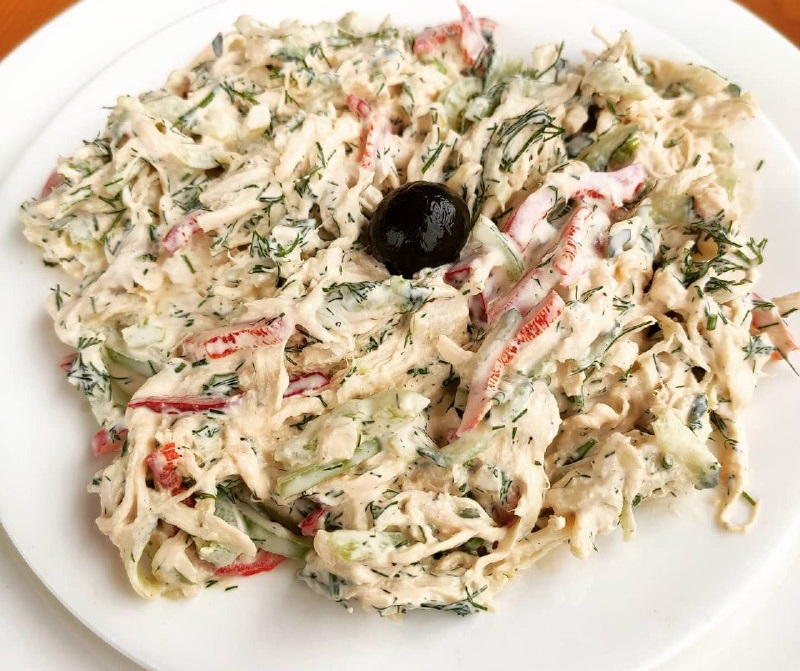 Ингредиенты: куриное филе (2 шт.), болгарский перец (1 шт.), огурец (1 шт.), лук (1 шт.), майонез, петрушка, укроп, кинза, соль, перец.