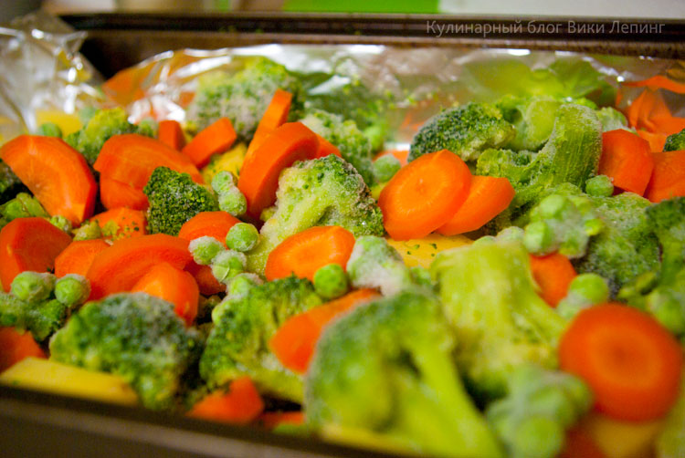 Продукты: замороженая смесь овощей, специи, растительное масло. Этот вариант также очень простой. Вам нужно разморозить овощную смесь в микроволновке и переложить на застеленный пергаментом противень. Полить растительным маслом, посыпать специями, перемешать и отправить в духовку на 25-30 минут.