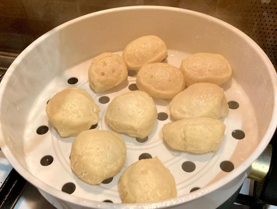 Варим галушки на пару 2-3 минуты. Во время варки они увеличатся в размере примерно в 2 раза. Затем выкладываем их в емкость, смазанную растительным маслом.