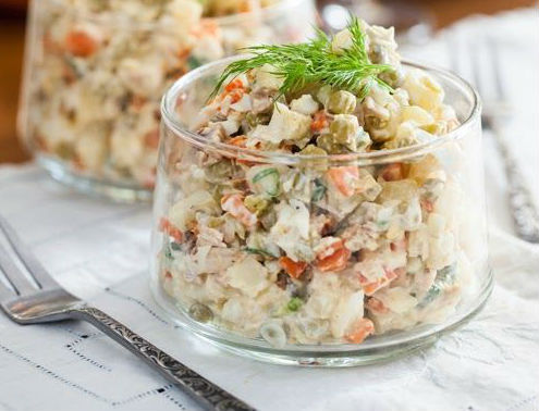 Главное отличие "облегченного" Оливье - курица вместо колбасы, отсутствие майонеза и бланшированный зеленый горошек вместо консервированного. Для заправки такого витаминного салата на новогодний стол используют йогурт с горчицей, которая придает блюду пикантную остроту.
