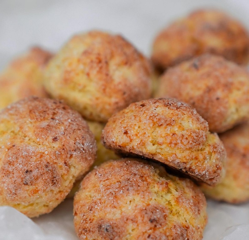 Затем просеиваем в творожную массу муку с содой или разрыхлителем. Замешиваем тесто, затем разделяем его на 10-11 равных частей, из каждой руками скатываем шарик – по размеру он должен быть как грецкий орех. Обваливаем каждое печенье в оставшемся сахаре (2 ст. л.).