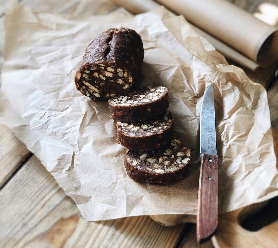 Когда смесь станет однородной, выкладываем ее на пищевую пленку или пергаментную бумагу. Тщательно трамбуем и руками формируем колбаску. Затем отправляем сладкий десерт на несколько часов в холодильник – до тех пор, пока шоколадная колбаска не затвердеет.