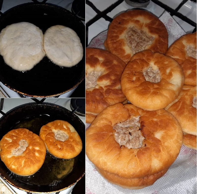 Разогреваем сковороду с большим количеством растительным маслом.Выкладываем несколько беляшей и жарим до красивого золотистого цвета, сначала отверстием вниз, затем – с другой стороны. Чтобы начинка получилась сочной, можно добавить в процессе жарки немного сливочного или растительного масла.
