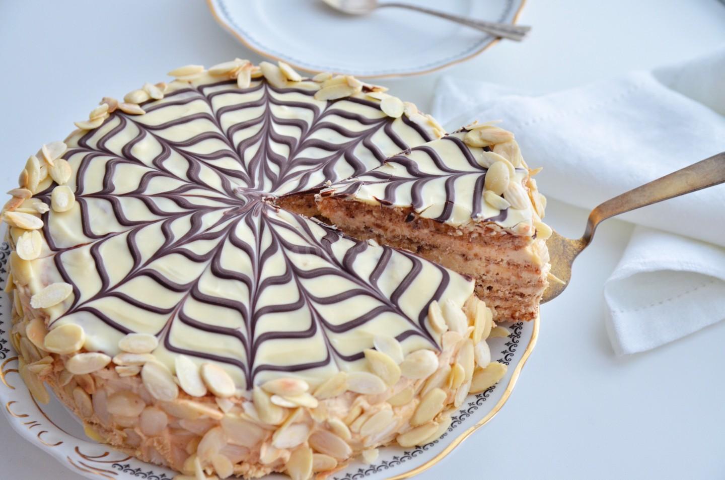 Растапливаем белый шоколад и смешиваем его со сливками, поливаем торт шоколадом. Когда он немного схватится, сверху делаем сверху узор черным шоколадом. Обсыпаем бока торта Эстерхази миндальной стружкой и отправляем его на 10-12 часов в холодильник.