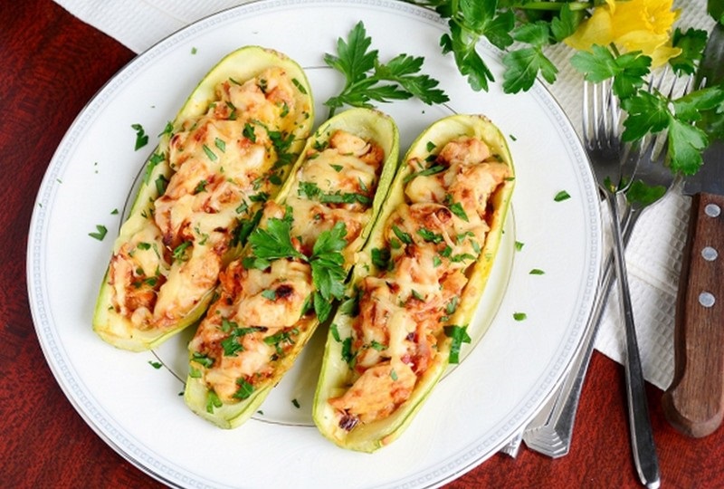 Вынимаем аппетитные кабачки-лодочки из духовки, перекладываем на тарелку для подачи.