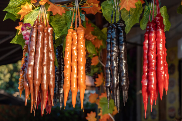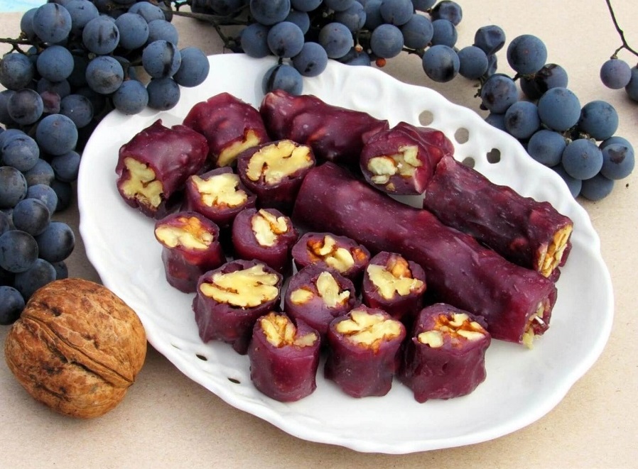 Чурчхела – это традиционное грузинское национальное блюдо, ставшее популярным у многих народов. Готовят ее из нанизанных на нитку очищенных орехов в загущенных мукой соках: виноградном, гранатовом или другом.