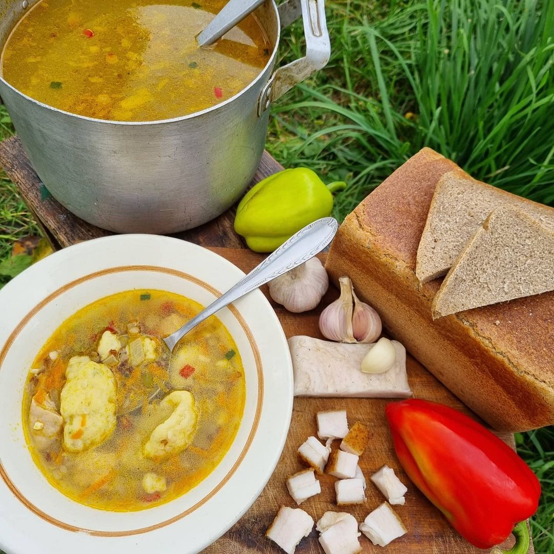 Ингредиенты: 3 крупные картошки, 1 яйцо, пучок укропа, 3 ст. л. муки с горкой, 1 луковица, 1 морковка, растительное масло для зажарки, куриное филе, полстакана гречневой крупы, 1 сладкий перец, 3 зубчика чеснока, лавровый лист, соль и перец по вкусу.