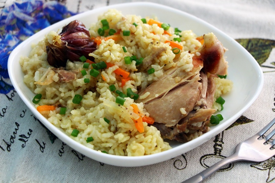 Ингредиенты: куриное филе, бедра или голени (800 г), длиннозернистый рис (300 г), вода (300 мл), чеснок (5 зубчиков), репчатый лук (150 г), морковь (200 г), растительное масло (40 мл), соль, специи (тмин, барбарис, шафран, куркума, перец красный и черный, чабрец).