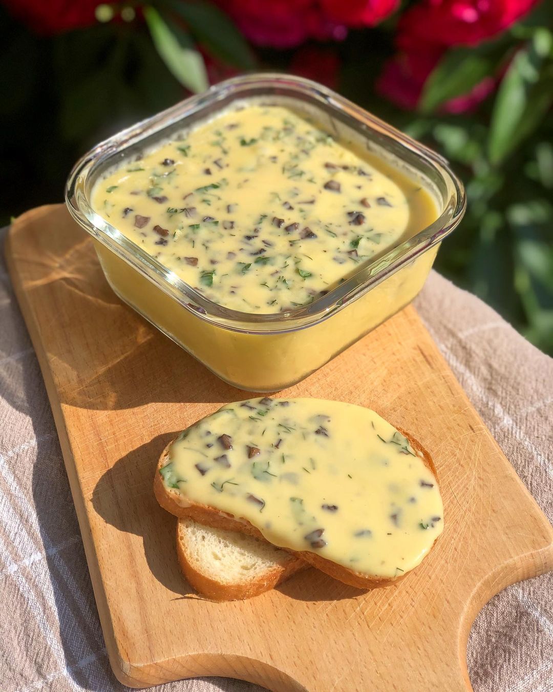 Переложите в пищевой контейнер или стеклянную банку, плотно закройте и поставьте в холодильник на несколько часов, а лучше на ночь. На утро плавленый сыр загустеет и будет хорошо намазываться на хлеб.