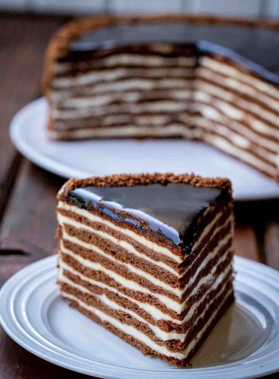 Собираем торт: ставим подложку или тарелку, на нее выкладываем первый корж, затем слой крема, снова корж, крем и так далее. Также смазываем борта торта. Последний корж не нужно смазывать кремом – для него сварим шоколадную глазурь.