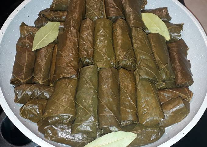 На дно кастрюли кладем несколько виноградных листьев, чтобы долма в процессе приготовления не пригорела. Плотно выкладываем конвертики швом вниз. Заливаем кипящей подсоленной водой и сверху накрываем тарелкой,чтобы долма не всплывала и листики не разворачивались. Тушим на слабом огне примерно 1 час.
