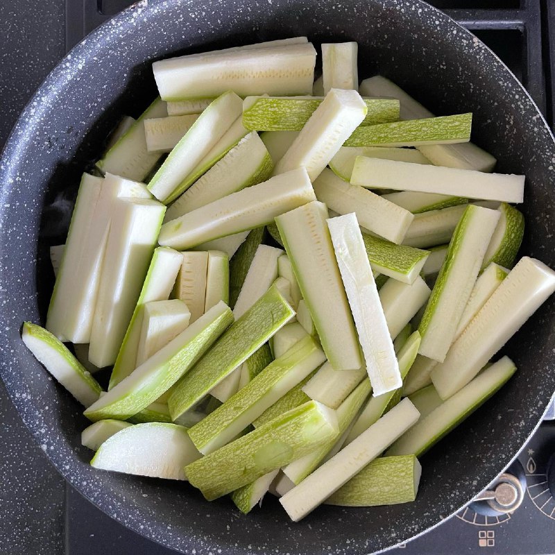 Для приготовления такого блюда необходимо взять небольшие молодые кабачки. Промываем их под проточной водой и нарезаем вместе с кожурой продолговатыми брусочками. Брусочки должны быть достаточно грубыми, чтобы во время приготовления кабачки не потеряли форму.