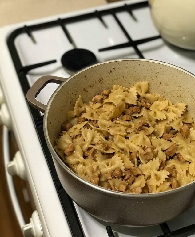 Возвращаемся к приготовлению макарон: в кипящую воду бросаем фарфале, варим их, после готовности перекладываем на дуршлаг, промываем и соединяем с курятиной. Все тщательно перемешиваем.