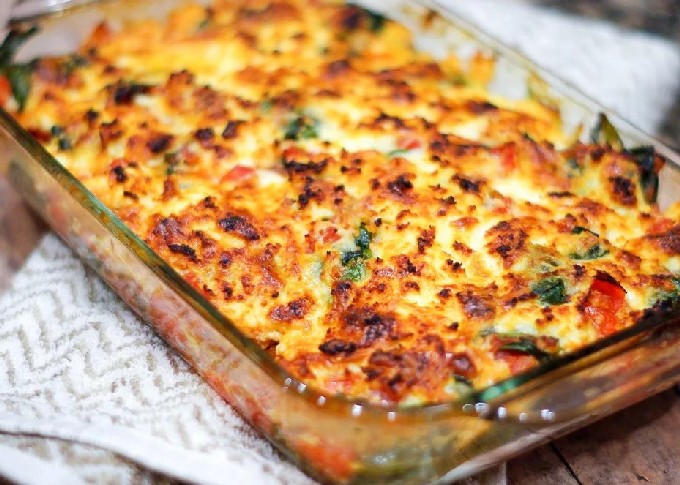 Ставим в духовку и запекаем при температуре 150-160°С около 15 минут – до образования румяной корочки на сыре.