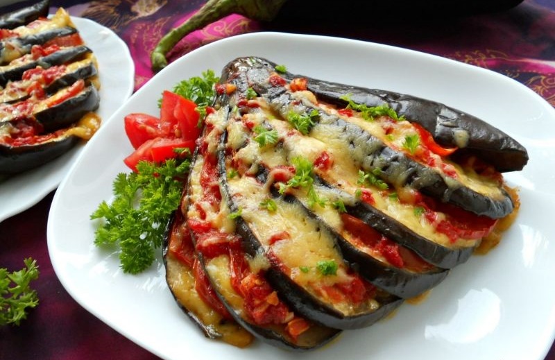 Ингредиенты: баклажаны (2-3 шт.), картофель (600-700 г), салатный перец (500 г), тертый сыр (150-200 г), томатный соус (0,2 л), растительное масло, соль, специи.