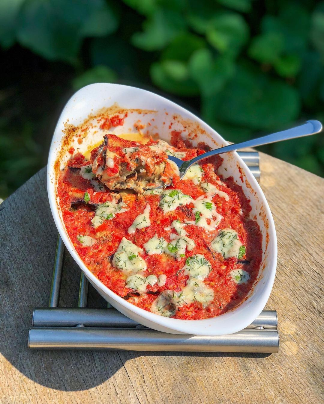 Ингредиенты: 2 баклажана, 250 г твердого соленого сыра (например, сулугуни), 2 зубчика чеснока, 1 ст. л. майонеза или сметаны, 400 г помидоров, специи и свежая зелень по вкусу.
