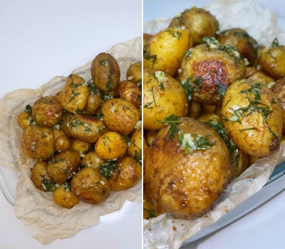 Ингредиенты: молодой картофель маленького размера (1 кг), растительное масло (4-5 ст.л.), сладкая паприка (1,5 ч.л.), сушеный чеснок (1,5 ч.л.), соль, перец (по вкусу), сливочное масло (30 г), чеснок (2-3 зубчика), укроп.